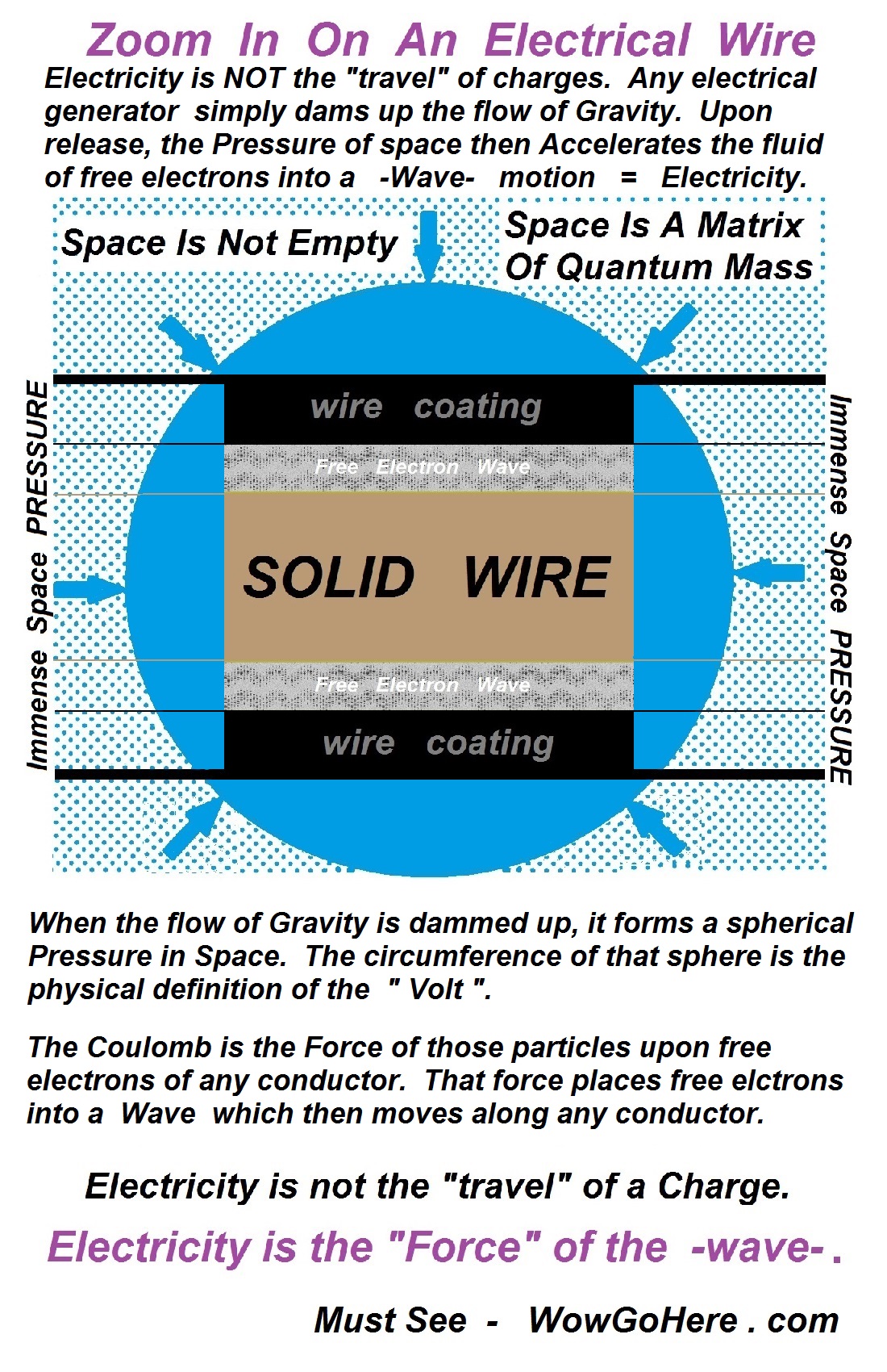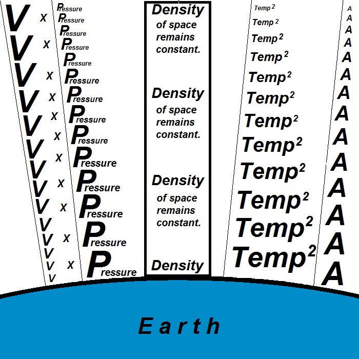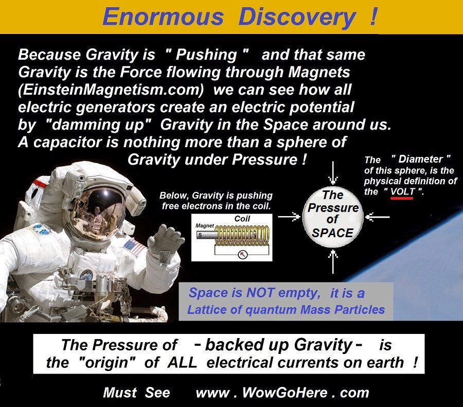 Be sure to understand that any volumetric expansion of the Pressure of electrical-mass that surrounds the earth is what then compresses back and Accelerates free electrons upon any given conductor thus creating a -wave- of electrical current upon that conductor. This elasticity of the quantum particles of space is the very source of "all" generated electricity around the world at this very moment. The Pressure (Density x Temperature2) of that ocean of electrical-mass that surrounds the earth is also the very origin of Gravity (your compared Density).