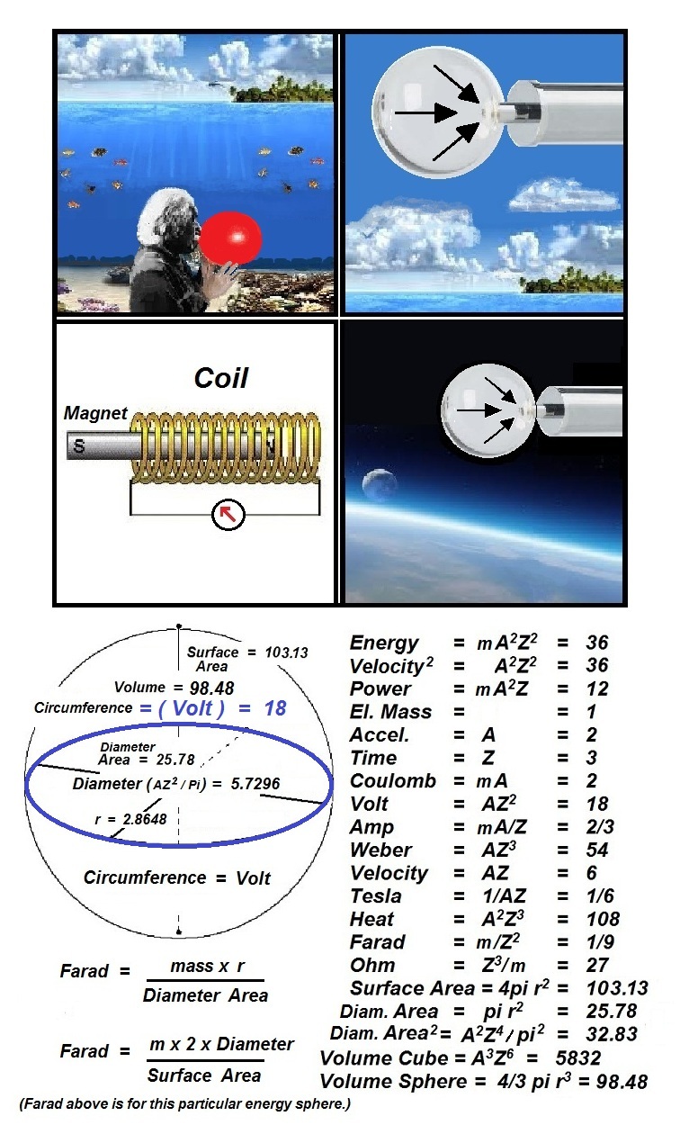 Coulomb (mA) / Area (A2Z4) = the 3-dimensional Pressure (m/AZ4) of electricity. Farad (m/Z2) / Distance (AZ2) = the 3-dimensional Pressure (m/AZ4) of electricity. Electricity is the direct result of the volumetric contraction of the elastic fabric of electrical-mass that surrounds the earth. This quantum fabric of space becomes expanded when a Capacitor is charged, and as it contracts it Accelerates free electrons upon any given conductor thus creating a -wave- of electrical current upon that conductor. This fabric of space composed of quantum mass is also know as the ether, the same ether that was not detected by Michelson and Morley due to the fact that it moves "with" the earth through space.