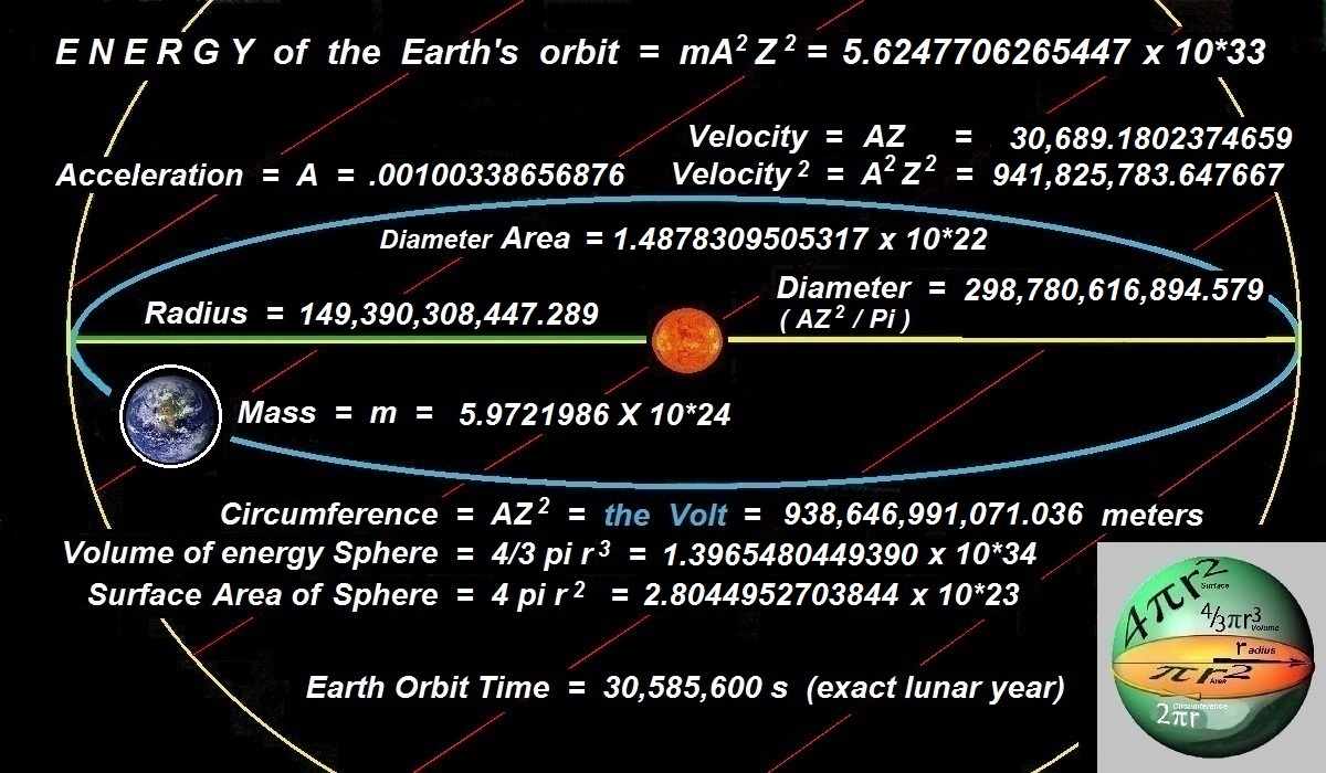 4 G = Gravity acc. earth 9.80 5 Dens = Density of earth 4884.3347342404 6 AZ = Ve = Velocity of earth 30689.1802376259 7 M.F. = Magnetic Field of earth .000032584773925436 8 Const = Orbital Constant 3131.5490038394 9 Press = Pressure of ether (space) 4600192388721.4535652897 10 R = Radius of Orbit 149417011803.3373753983 11 AZ2 / Pi = Diameter of orbit 298834023606.6740014972 12 AZ2 = Circumference of orbit 938814773208.4623287290 13 S.A. = Surface Area orb. sphere 280549766208294700469089.1113553686 14 VolSph = Volume of orbit sphere 13972968498619425271501258172487783.2996135509 15 Ac = Centripetal acceleration .0063033370 16 re = Radius of planet earth 6468673.3827829229 17 diam e = Diameter of planet earth 12937346.7655658458 18 circ e = Circumference of earth 40643873.5557773826 19 s.a. e = Surface Area of earth 525823886086903.4639383167 20 Vol = Volume of earth 1133794325320611315049.2969503907 21 299 = Speed of light 299792458 22 Vs = Velocity of sun 385651.6127181273 23 E=mv2 = Energy of earth in orbit 5215672025715451789304274238243980.1621185063 24 E=mc2 = Energy of earth mass 497715429439681300664193456153788252170983.5485285508
