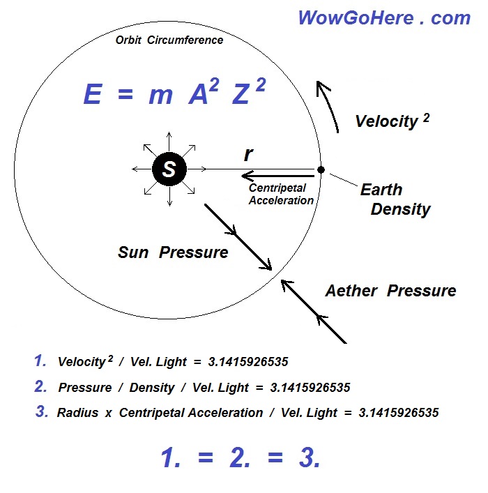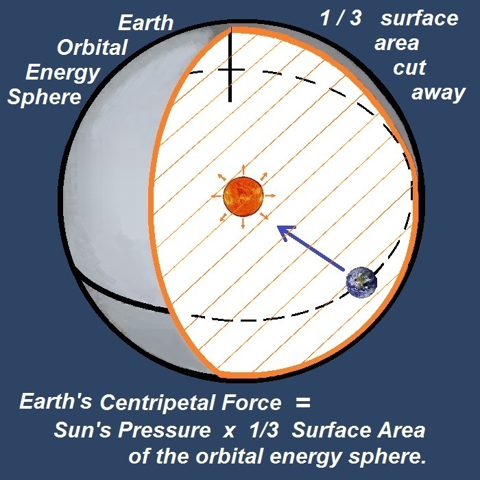 13) The Centripetal Force of the earth moving around the sun is equal to the mass of the earth multiplied by earth's centripetal Acceleration. The centripetal acceleration of the earth is Velocity2 divided by orbit Radius = .0063033370316129778. Therefore earth's centripetal Force is = 3.7651509559105 x 1022. Hence when you take the Pressure of the electrical-mass coming off the sun which is the pressure within the earth's energy sphere (.40276241457847) and multiply it by 1/3 of the surface area (orange lines) of the energy sphere (the amount of force that pushes the earth outwards), you get the exact same force that outer space is pushing back against the earth, which is the Centripetal Force of the earth = 3.7651509559105 x 1022.